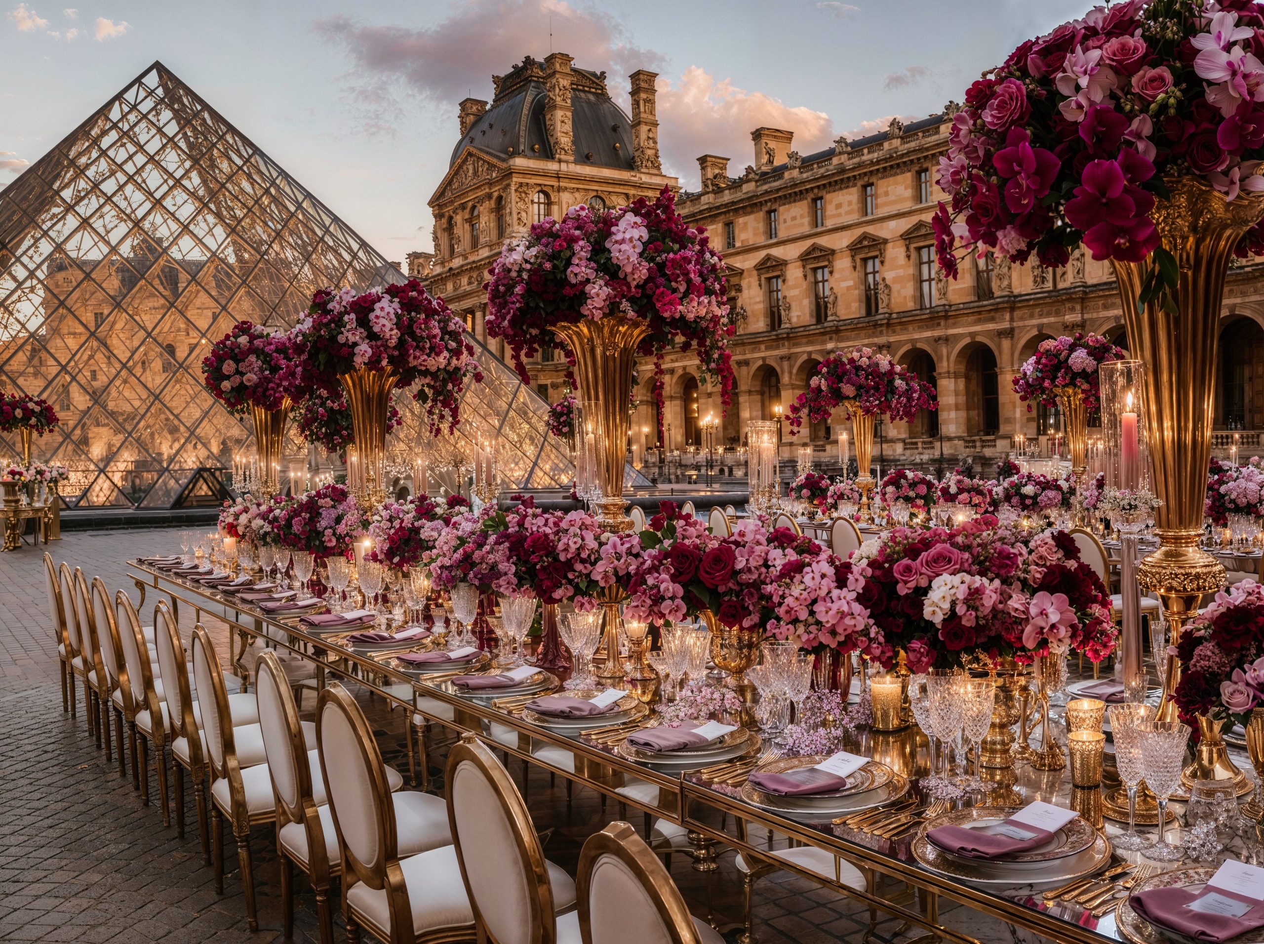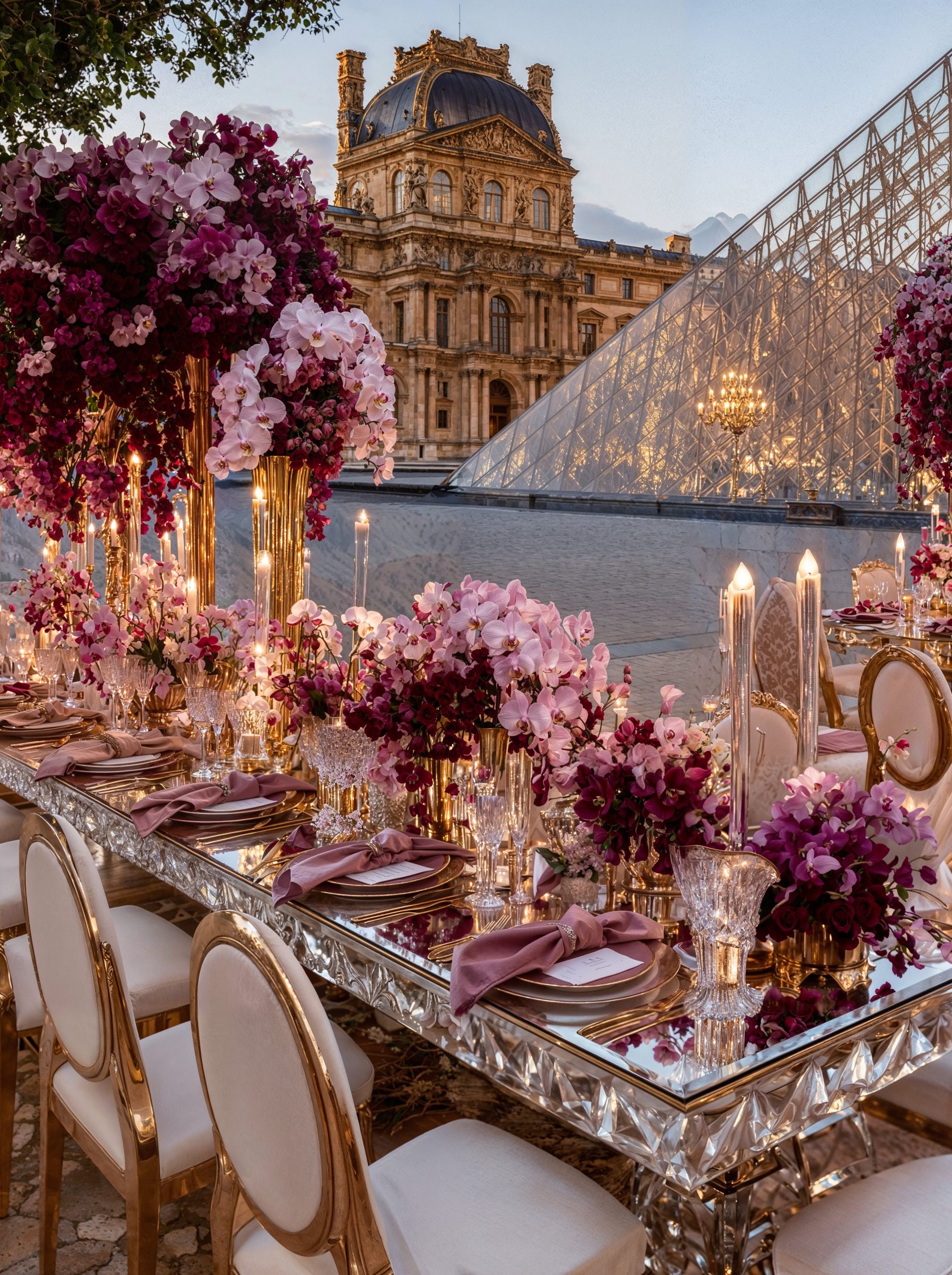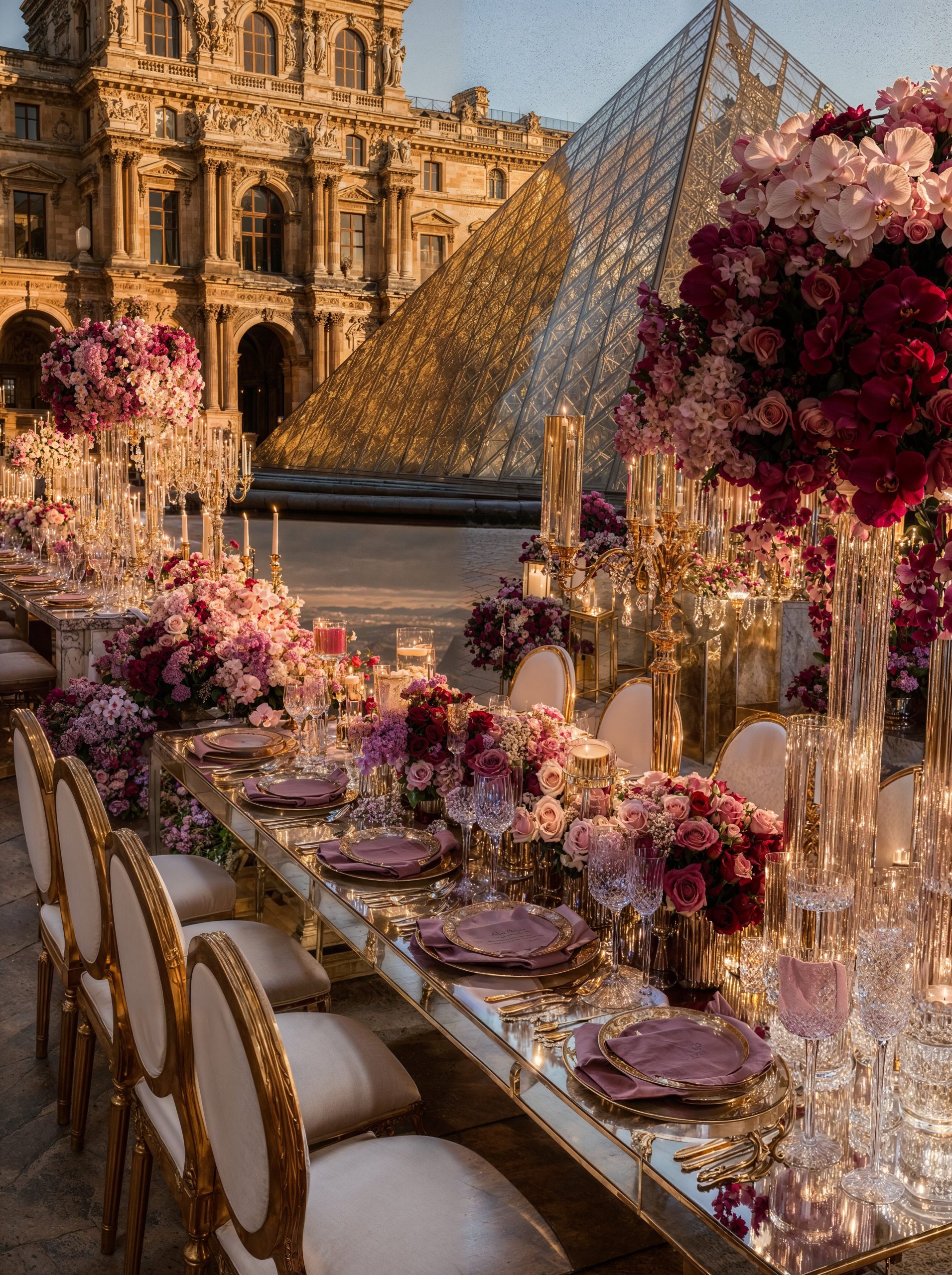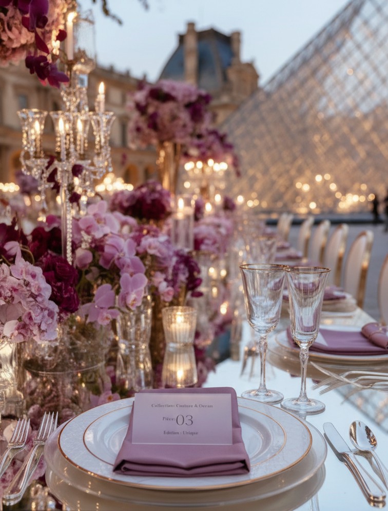 Face au Louvre, au cœur de Paris, l’amour s’est écrit dans un décor floral majestueux. Des compositions opulentes mêlant mauves délicats, roses poudrés et nuances profondes de purple ont enveloppé la cérémonie d’une élégance absolue, presque irréelle. Dans cette ville lumière, chaque détail a été pensé comme une scène éditoriale. Les fleurs dialoguaient avec l’architecture, la douceur des teintes sublimait la puissance du lieu, et le temps semblait suspendu autour d’un couple tout simplement magnifique. Un mariage à Paris, inoubliable et intemporel. Là où le luxe rencontre l’émotion, face à l’un des plus beaux symboles du monde.