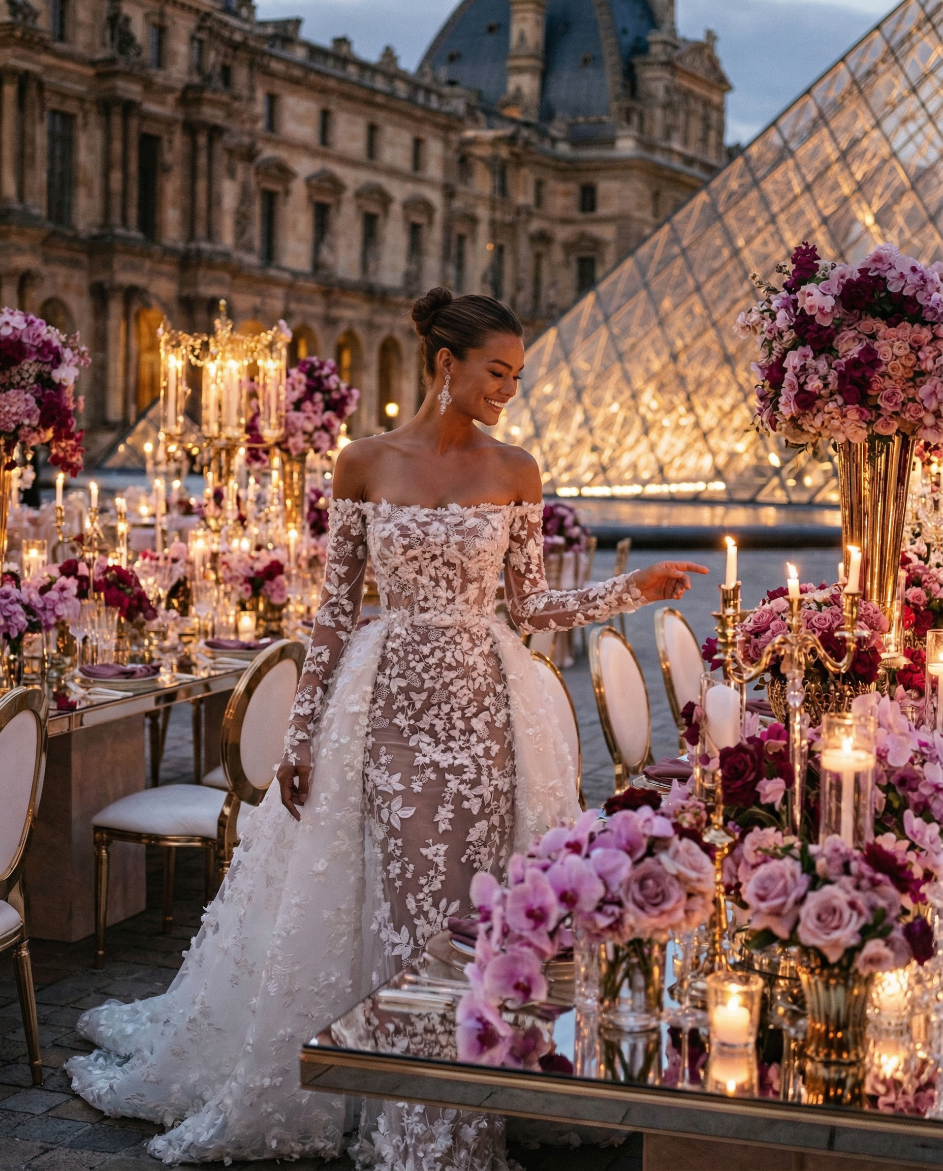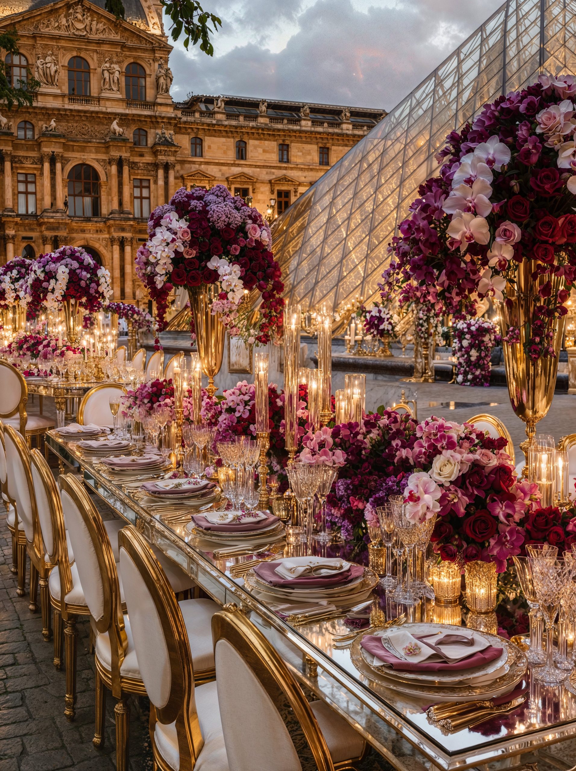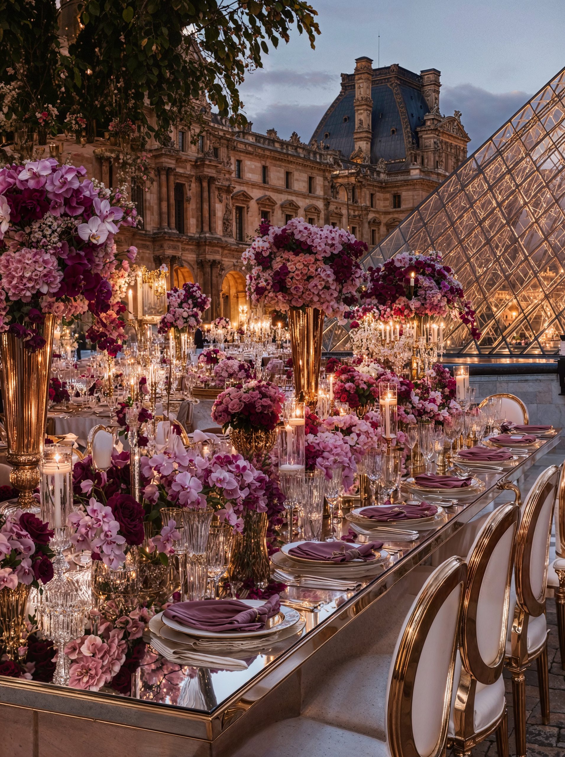 Face au Louvre, au cœur de Paris, l’amour s’est écrit dans un décor floral majestueux. Des compositions opulentes mêlant mauves délicats, roses poudrés et nuances profondes de purple ont enveloppé la cérémonie d’une élégance absolue, presque irréelle. Dans cette ville lumière, chaque détail a été pensé comme une scène éditoriale. Les fleurs dialoguaient avec l’architecture, la douceur des teintes sublimait la puissance du lieu, et le temps semblait suspendu autour d’un couple tout simplement magnifique. Un mariage à Paris, inoubliable et intemporel. Là où le luxe rencontre l’émotion, face à l’un des plus beaux symboles du monde.