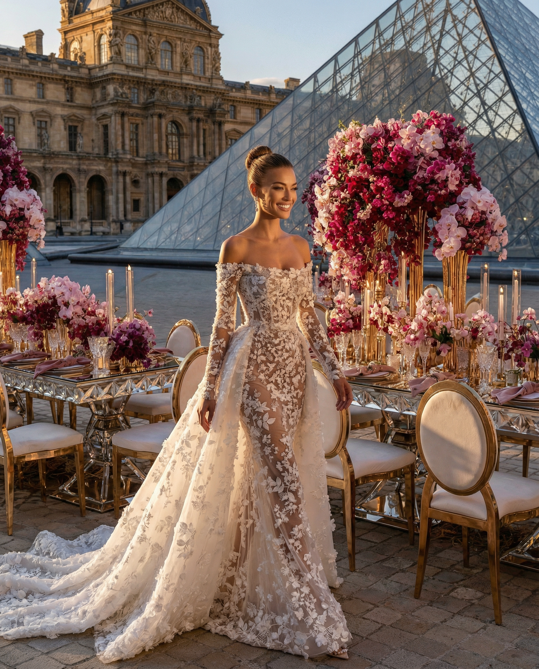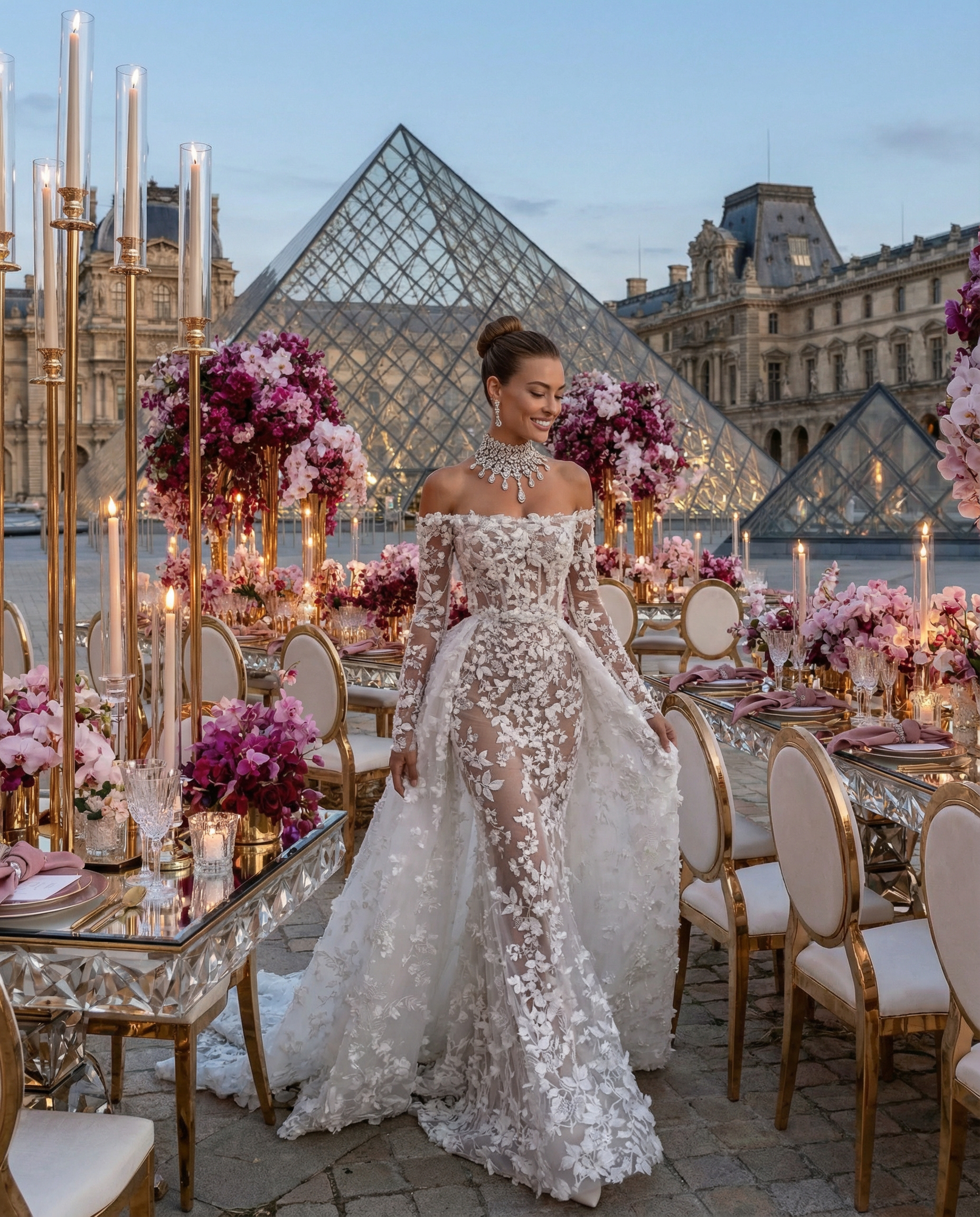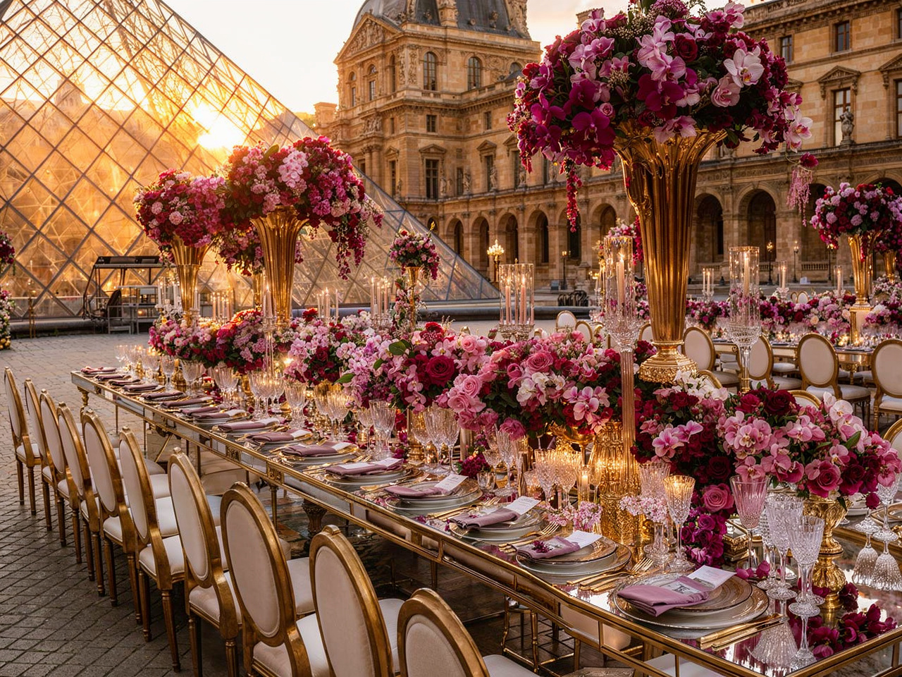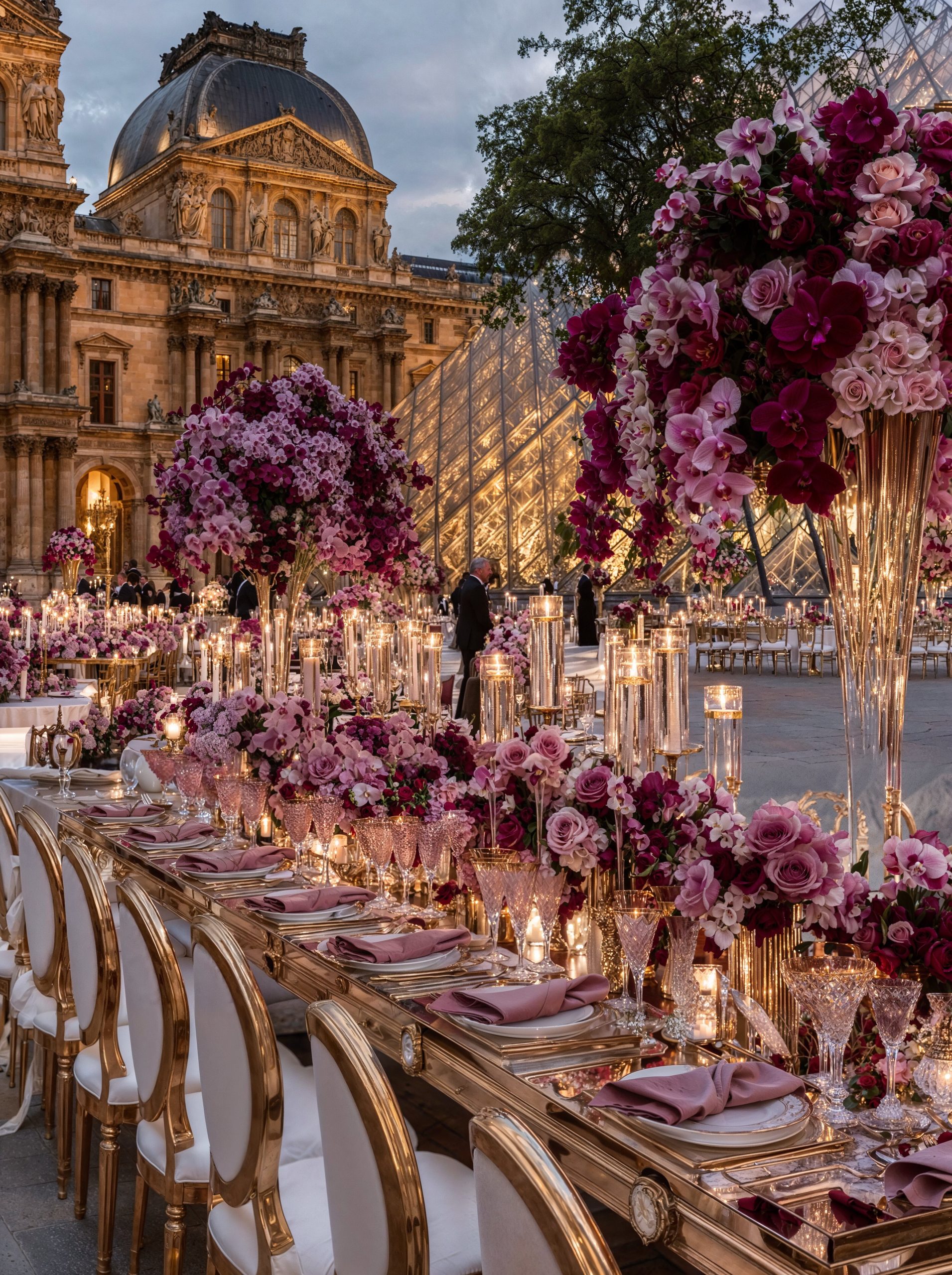 Face au Louvre, au cœur de Paris, l’amour s’est écrit dans un décor floral majestueux. Des compositions opulentes mêlant mauves délicats, roses poudrés et nuances profondes de purple ont enveloppé la cérémonie d’une élégance absolue, presque irréelle. Dans cette ville lumière, chaque détail a été pensé comme une scène éditoriale. Les fleurs dialoguaient avec l’architecture, la douceur des teintes sublimait la puissance du lieu, et le temps semblait suspendu autour d’un couple tout simplement magnifique. Un mariage à Paris, inoubliable et intemporel. Là où le luxe rencontre l’émotion, face à l’un des plus beaux symboles du monde.